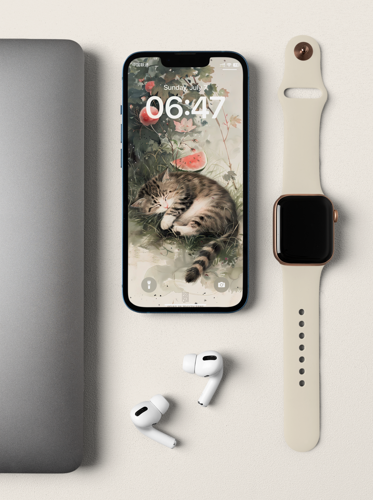 - Description: A tabby cat lazily resting beside a watermelon, set against a backdrop of blooming summer flowers, exuding a sense of summer coolness and tranquility.
